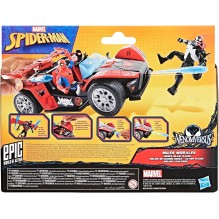 Le Bolide de course Remix de Spidey accueille deux figurines de 10 cm et inclut une figurine Miles Morales aux couleurs rouge et noir. Le véhicule permet de tirer des projectiles en forme de toile grâce à un bouton d’action, et son aileron amovible peut se transformer en planeur pour équiper Miles. Personnalisable avec une feuille d’autocollants, ce coffret est compatible avec l’univers Epic World of Action de Hasbro.